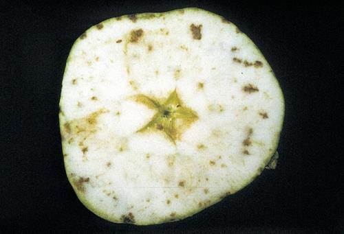 Low calcium concentrations produce bitter pit shown by depressed, sometimes dark areas on apple surface and small, brown corky areas within flesh.