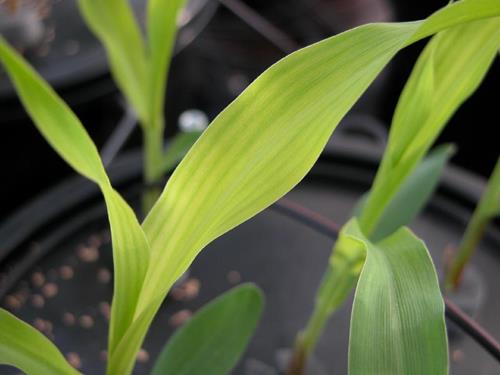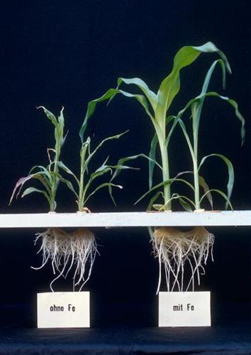 Symptoms of iron deficiency start on younger leaves. Plants show chlorotic leaves with interveinal stripes. When the deficiency becomes severe the veins also become chlorotic and plant growth is stunted.