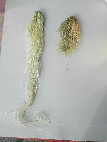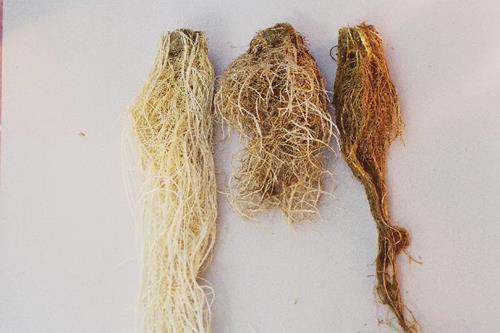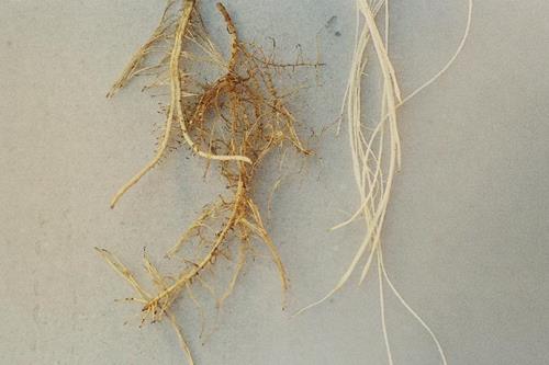 Calcium deficiency on roots (left-hand side) compared to healthy roots