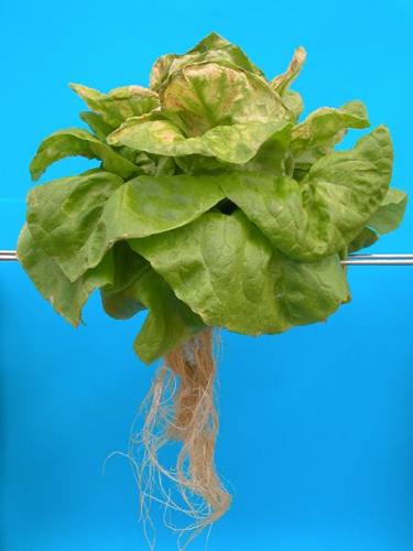 Plants seem to be wilted and flabby. Along leaf tips and margins chlorotic mottling arises, which proceeds from old to younger leaves. Grey-brown necrotic areas develop in the chlorotic zones. Starting on the tips, leaves turn yellow and fade.