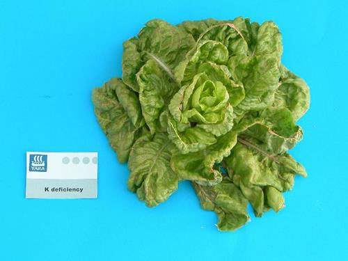 Symptoms of potassium deficiency start on older leaves. The leaf color turns to mottled dark green and the plant appears wilted. Tips and margins get chlorotic spots with increasing size which become necrotic later on. On account of scorched leaf margins leaves are deformed. On the photo necrotic areas appear along the main veins. More typical are scorched zones on the margins.