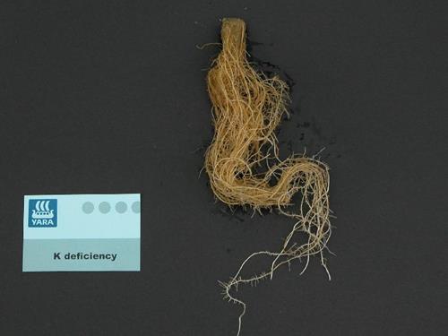 Potassium deficiency causes longer main roots than normal and only few secondary roots. Often roots are slimy and yellowish in color.