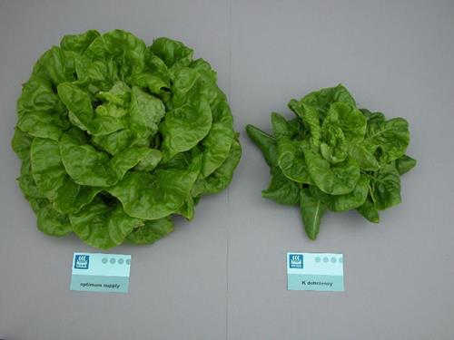 With more severe deficiency the leaf color turns to mottled dark green and the plant appears wilted. Occasionally leaves are less crinkled than normal and shape of the leaves becomes more rounded.