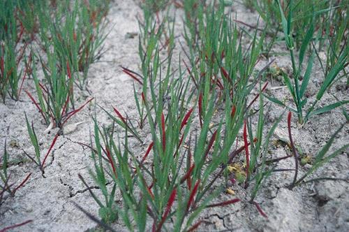 Spring cereals may show reddening/purpling of older leaves in cold weather. Root and stem damage or poor soil consolidation can cause similar symptoms, too.