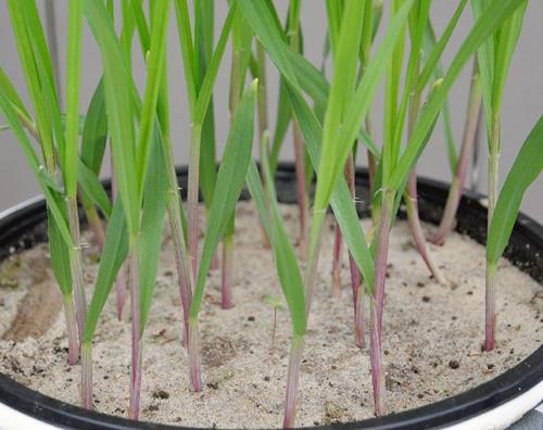 Plants are stunted and show purple tints on their stems.
