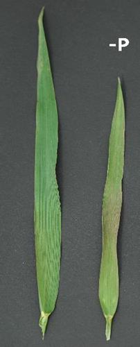 Plants with P deficiency are smaller than normal and show purple tints on their dark green leaves, especially on the middle of the leaf blade.