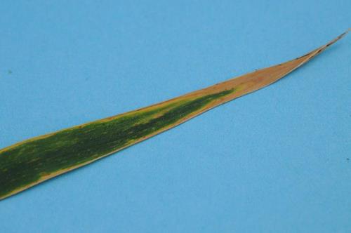 Young leaves are blueish green, the older ones show chlorotic tips and margins, followed by necrosis.