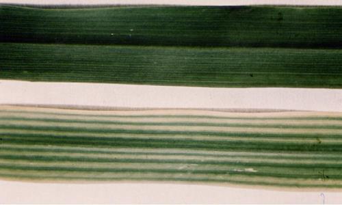 Leaves are blueish green with chlorotic tips and margins. Growth is reduced due to shortened internodes as deficiency becomes more severe.