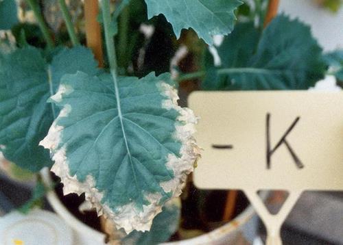 Before specific symptoms occur, potassium deficiency causes growth and yield depressions of the plants. Younger leaves remain smaller, and later, growth of the plants is stopped. Specific deficiency symptoms occur on medium/older leaves first. They show chlorotic zones on the leaf margins which become necrotic later. The younger leaves get a blue-green colour.