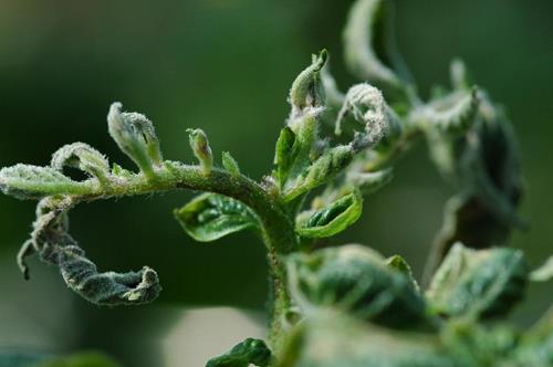 Young shoot tips are deformed as the young leaflets are not developed properly. Remaining leaf stubs show dark brown necrosis.