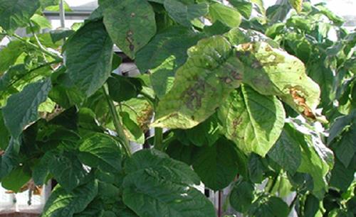 Greyish brown to bronze coloured blotches appear first on the middle of the leaves, later all over the foliage.
