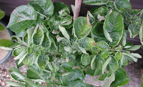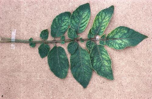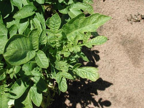 The leaves are deformed and folded inwards ('fern leaf of potato' ).
