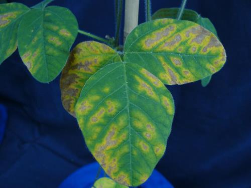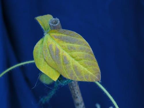 Plants suffering from P deficiency usually show a dark green to bluish tint on their foliage. In the displayed picture, leaves  show an even chlorosis and a dark, brownish  tint on the interveinal fields.