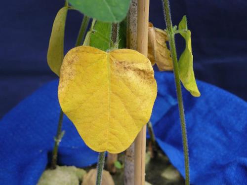 In the displayed picture, leaves  show an even yellow chlorosis and a beginning light brown necrosis on the marginal area of the leaf base.